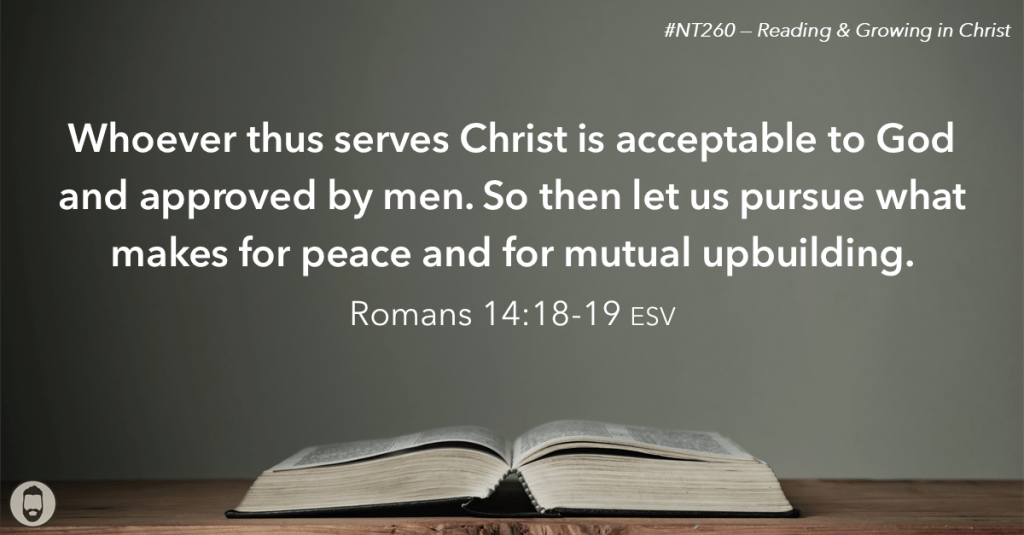 Reach out to a believer whose preferences or convictions differ from yours. Listen without mocking or correcting, and encourage them in what you share in common—Jesus is Lord, and you both belong to Him (vv. 8–9). Then choose one practical way this week to pursue peace and build them up (v. 19).