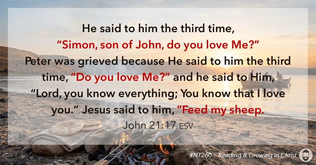 The heart of the chapter is Jesus’ restoration of Peter. Around another charcoal fire — the kind that must have reminded Peter of the place where he denied Jesus three times (John 18:18, 25–27) — Jesus now asks Peter three times, “Do you love me?” (John 21:15–17). Peter had failed badly, but Jesus does not discard him. He restores him and recommissions him: “Feed my lambs,” “Tend my sheep,” and “Feed my sheep” (John 21:15–17). Love for Jesus must lead to faithful care for Jesus’ people. Peter’s calling would not be easy, because Jesus also tells him that one day he will glorify God in death (John 21:18–19). Still, the command is simple and clear: “Follow me” (John 21:19). The Christian life is not built on pretending we have never failed. It is built on the grace of the risen Christ, who forgives, restores, and calls us forward in obedience.