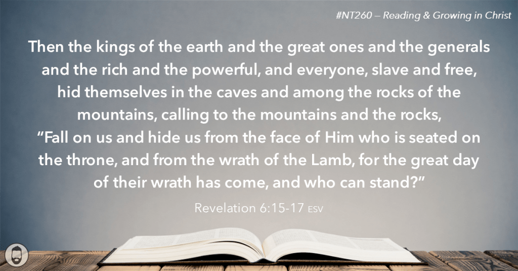 Revelation 6 shows the Lamb opening the first six seals of the scroll, unleashing a series of judgments on the earth (vv. 1–17). The first four seals reveal riders on horses symbolizing conquest, war, famine, and death — forces allowed by the Lamb to bring judgment on a broken world (vv. 1–8). The fifth seal reveals the souls of martyrs crying out for justice, and they are told to rest until God’s purposes are complete (vv. 9–11). The sixth seal brings cosmic upheaval — earthquakes, darkened skies, and collapsing creation — causing people of every status to hide in fear, recognizing that the day of God’s wrath has come (vv. 12–17).
