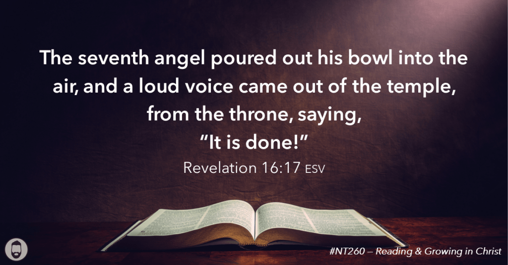 Revelation 16 describes the pouring out of the seven bowls of God’s wrath, completing His judgment on a rebellious world (vv. 1–21). These judgments affect the earth, sea, rivers, sun, and the beast’s kingdom, bringing sores, blood, scorching heat, darkness, and devastation (vv. 2–11). Despite the severity, many still refuse to repent and instead curse God (vv. 9, 11). The sixth bowl prepares the nations for the final battle at Armageddon (vv. 12–16). With the seventh bowl, a voice from heaven declares, “It is done!” as a great earthquake and catastrophic destruction bring the collapse of human systems opposed to God (vv. 17–21).